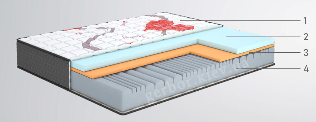 - Memory Blue Gel – інноваційний пінний матеріал із вкрапленнями охолоджуючого гелю, що підтримує оптимальну для сну температуру поверхні матраца.